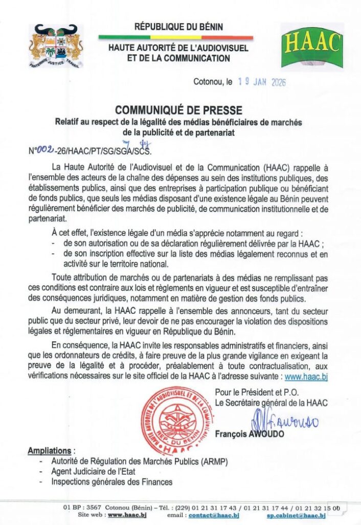 La Haute autorité de l’audiovisuel et de la communication (HAAC) appelle au respect des textes en vigueur au Bénin. A travers le communiqué N°002-26/HAAC/PT/SG/SGA/SCS du 19 janvier 2026, l’institution de régulation des médias invite à respecter la légalité des médias bénéficiaires de marchés publics et de partenariat. Selon le communiqué, seuls les médias disposant d’une existence légale au Bénin peuvent bénéficier des marchés de publicité, de communication institutionnelle et de partenariat sur fonds publics. La légalité d’un média repose selon l’institution de régulation sur deux critères.